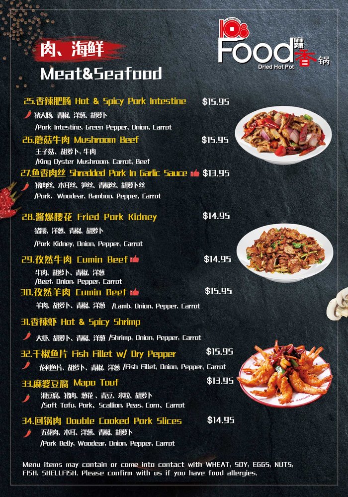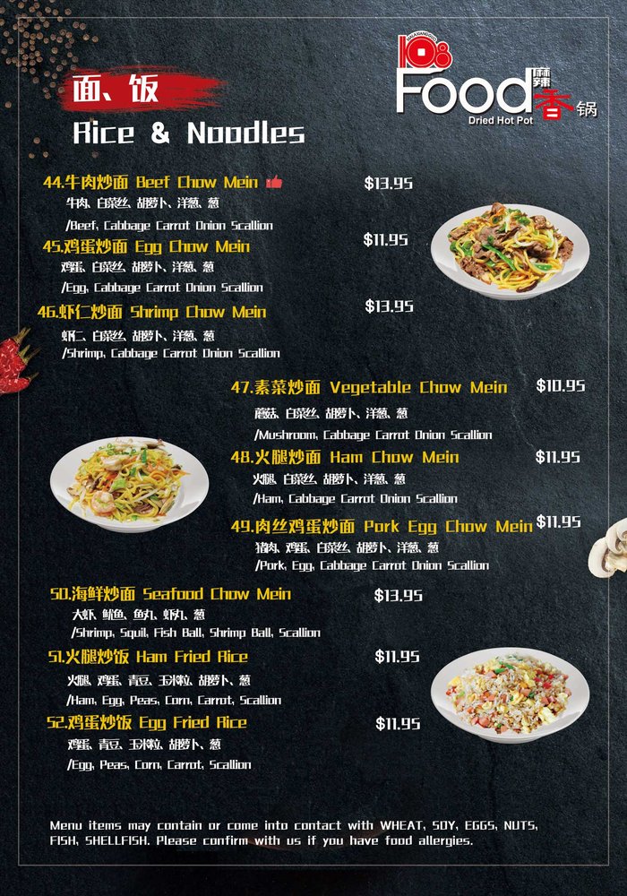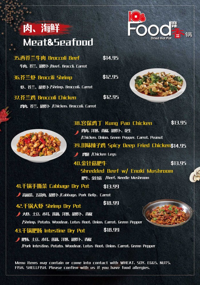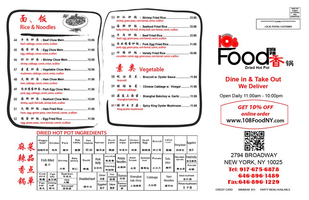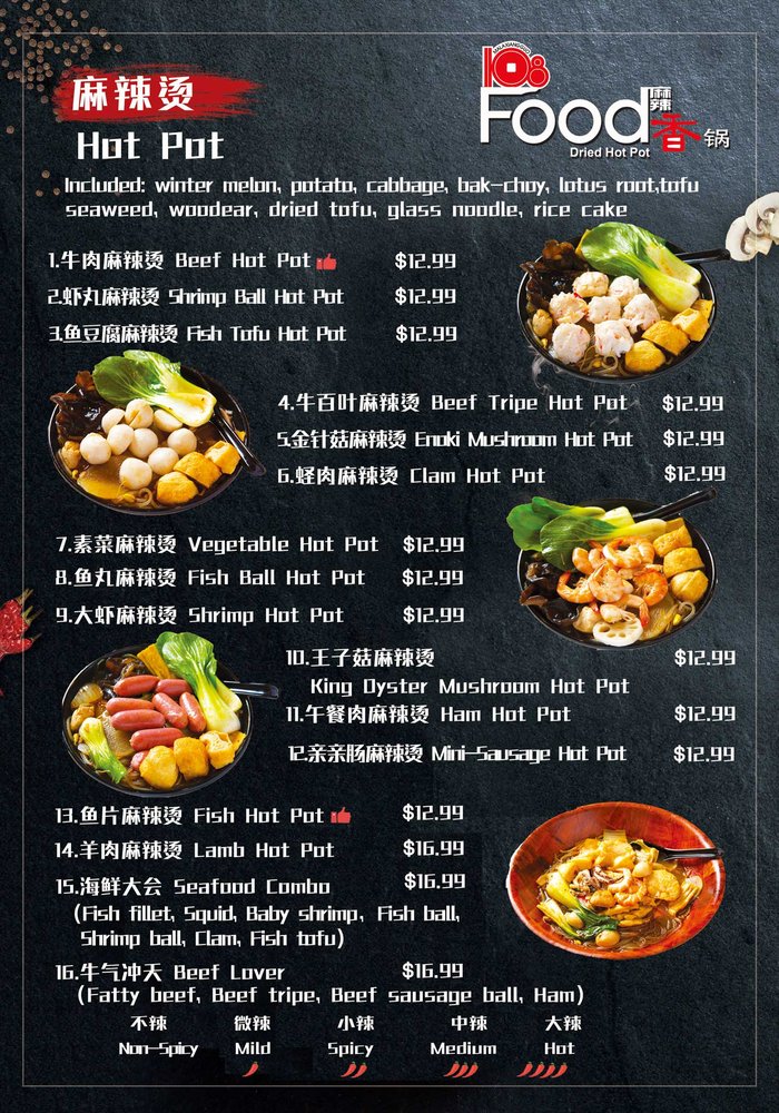 Introducing the menu at 108 Food Dried Hot Pot - a hidden gem in New York City known for its authentic Chinese dry hot pot experience. Offering a wide range of fresh ingredients, including vegan and vegetarian options, customers can customize their meal with various proteins, vegetables, and noodles. The signature mala dry pot is a favorite among patrons, delivering the perfect balance of spiciness and numbing sensation. While the prices may be a bit on the higher side, the quality and flavors of the dishes make it worth the cost. With options for both dine-in and takeout, 108 Food Dried Hot Pot caters to a diverse audience craving a flavorful and satisfying hot pot experience. The atmosphere is casual and welcoming, making it a great spot for a quick lunch or a relaxed dinner with friends. Don't miss out on this culinary delight in the heart of Manhattan!